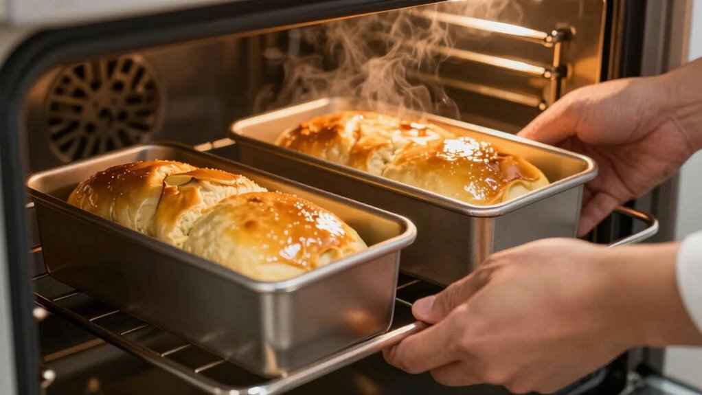 Remember, rotating your pans is like steering a ship through calm waters—you keep everything on course and guarantee an even bake. By timing your rotations just right, you’re guiding your baked goods to perfection, avoiding those pesky hot spots. Think of it as giving your oven a gentle nudge, helping heat distribute evenly across your treats. Master this simple trick, and your baked creations will come out looking and tasting like they’ve been kissed by a pro baker’s touch.