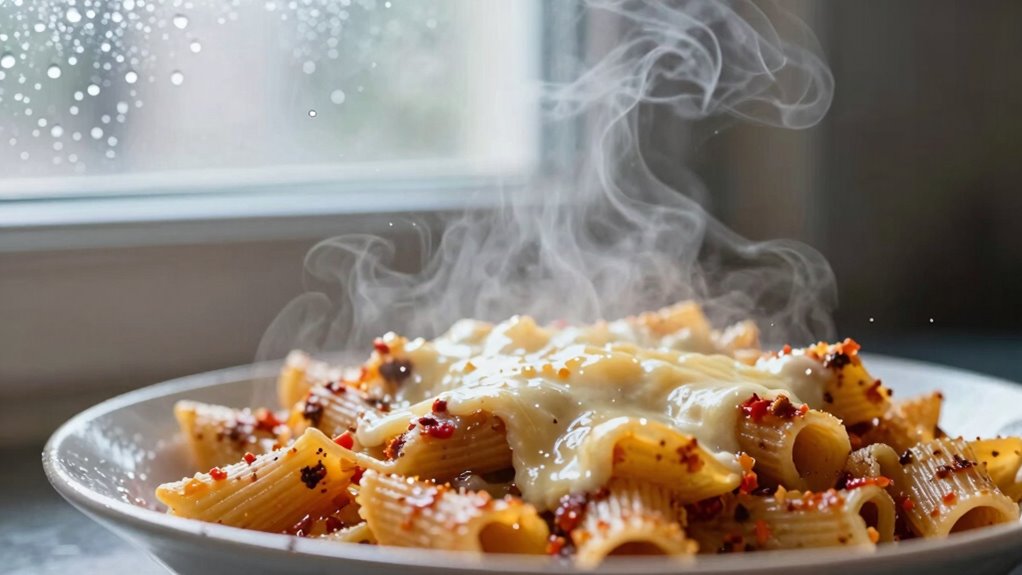 Imagine reheating leftover soup in your microwave; you’ll likely notice microwave moisture causing reheating condensation. Microwave moisture builds up because heat causes water molecules in your food to vaporize, then condense on the cooler microwave interior surfaces. This reheating condensation makes your food damp, especially if you cover it tightly. To reduce this, vent the cover slightly or reheat in shorter intervals, allowing moisture to escape and keeping your food dry.