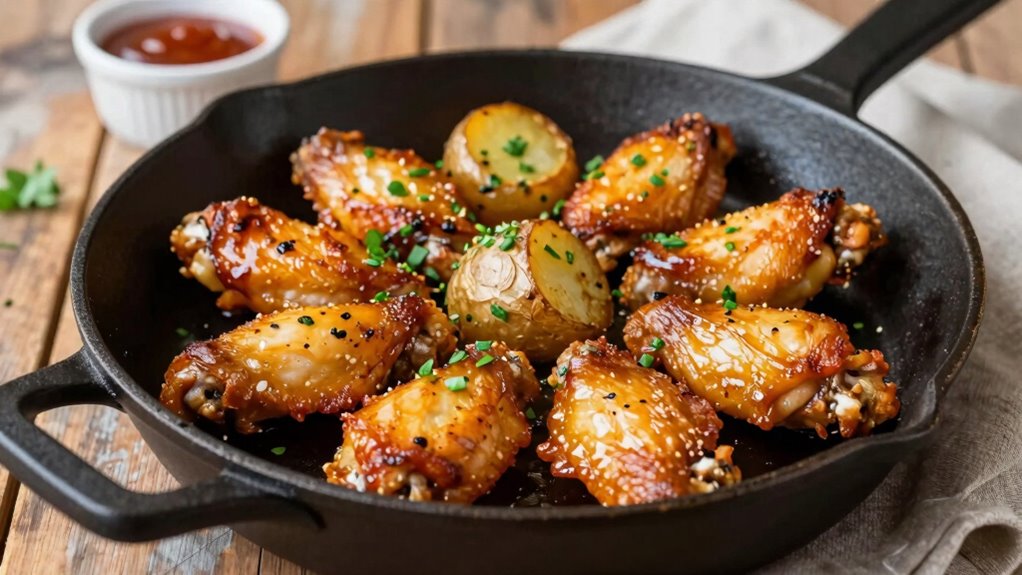 Choosing the right pan size depends on your dish, but generally, a smaller pan helps achieve crispiness without overcrowding. Investigate the theory that more surface area equals better crisping—it’s true! Opt for lightweight cookware materials like stainless steel or cast iron, which heat evenly and help crisp foods. Use a pan just large enough to hold your portion comfortably, allowing heat to circulate and ensuring that your crispy dish turns out perfect every time.