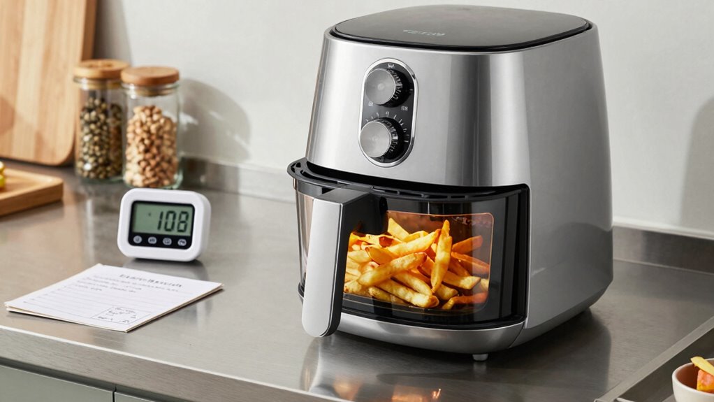 Rapid air circulation is what sets air fryers apart from traditional ovens. This technology creates a hot, moving stream of air that surrounds your food, leading to faster cooking times and crispy textures. This rapid movement is responsible for the even heat distribution that improves cooking results. The key lies in airflow consistency and adjustable fan speed, which ensure even heat distribution. Unlike ovens, where heat can be uneven, air fryers rapidly circulate air at high speed, reducing cooking time and improving results. This dynamic movement allows you to achieve crispy exteriors without excess oil. Additionally, airflow efficiency plays a vital role in optimizing cooking performance and energy use. Proper airflow not only enhances food quality but also contributes to the overall energy efficiency of the appliance.