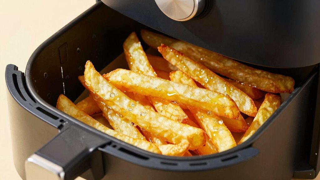 Even experienced cooks can fall into the trap of over- or under-oiling their food in the air fryer if they aren’t careful. One common mistake is using too much oil, leading to oil pooling at the bottom of the basket, which can cause greasy results and uneven cooking. Conversely, using too little oil results in an uneven coating, preventing the food from becoming crispy. Another mistake is applying oil unevenly, which can cause some parts to be over-oiled while others remain dry. To avoid these issues, measure your oil carefully and guarantee an even distribution across your food. Properly controlled oil use minimizes pooling and promotes consistent, crispy results without excess greasiness or dryness.
