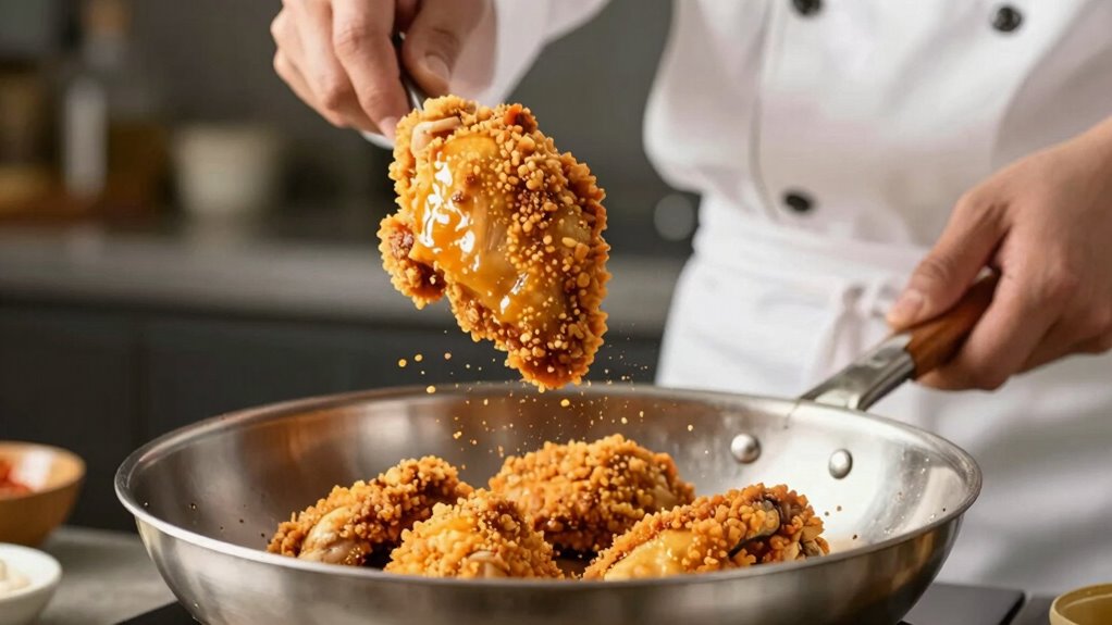 Flipping at a consistent speed helps maintain coating toughness and prevents it from peeling off. If you flip too quickly, the coating might not have enough time to adhere properly, causing it to break apart. Conversely, flipping too slowly can cause uneven cooking. To keep the coating intact, develop a steady, controlled flipping speed, ensuring the food maintains its crispy exterior and the coating stays securely on.