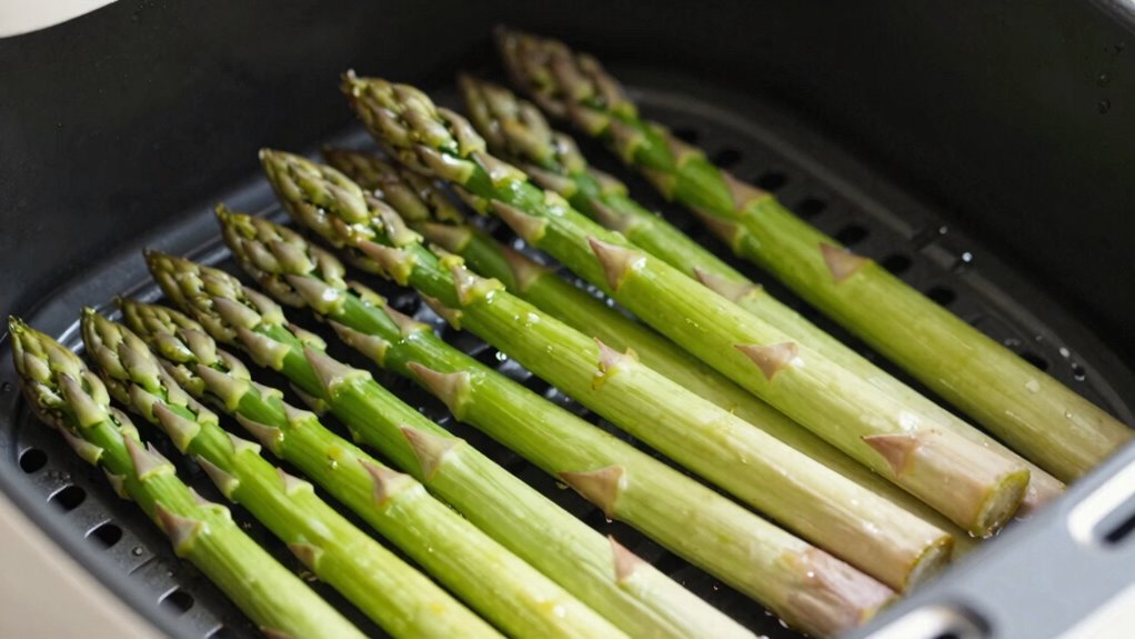 You’ll know your asparagus is fully cooked and crispy when the stalks are tender but still hold their shape, and the tips have turned a golden-brown color. The crispy texture indicates it’s done, and it hasn’t been overcooked, preserving its nutritional benefits. Proper asparagus storage before cooking guarantees freshness, which impacts how quickly it reaches this perfect doneness. Look for vibrant color and firm yet tender stalks to confirm readiness. Crispy tips are a good sign that the asparagus has absorbed enough heat. Keep in mind that overcooking can diminish its nutritional benefits, especially vitamins like C and K. When you see these signs, you’ll enjoy flavorful, nutrient-rich asparagus with the ideal crispy texture straight from your air fryer.