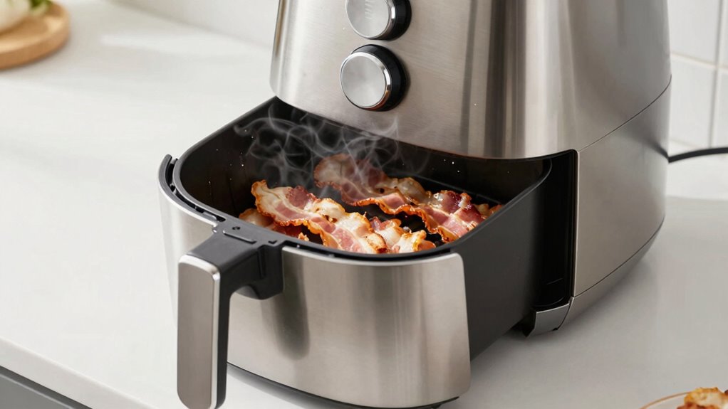 To prevent smoke and lingering odors when cooking bacon in your air fryer, managing the amount of grease that drips and vaporizes during cooking is vital. Excess grease can cause smoke and interfere with your bacon flavor, making your kitchen less pleasant. Proper kitchen ventilation helps clear out odors quickly and keeps smoke at bay. To minimize issues, consider these tips: