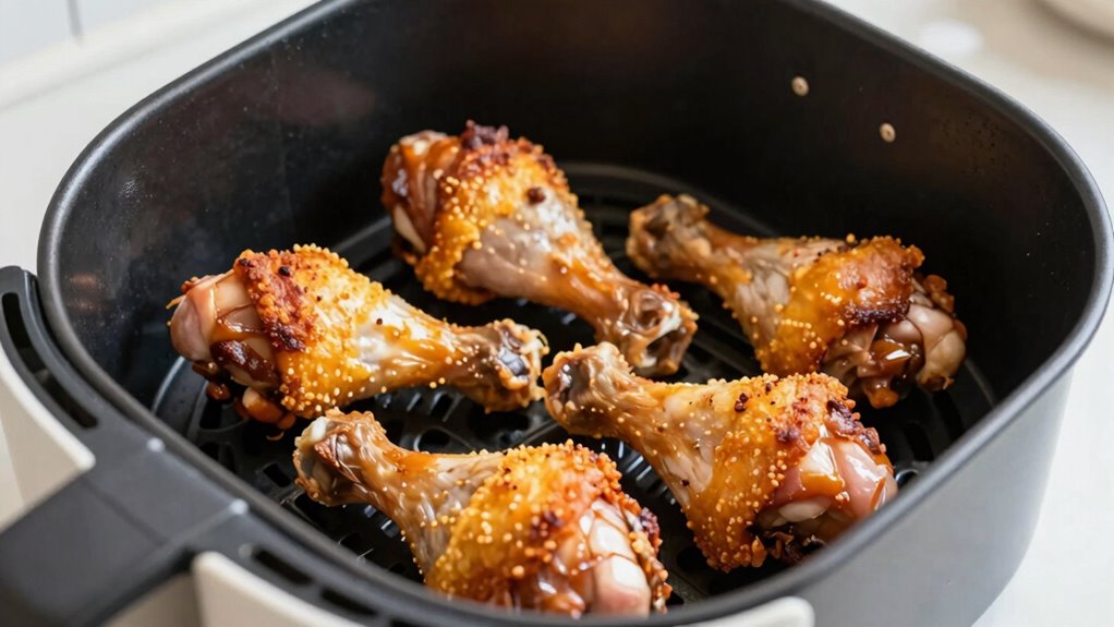 Preheating your air fryer helps guarantee your chicken drumsticks cook evenly. Set the right temperature and give it enough time to heat up properly. Using a cooking thermometer can help you check when it’s ready to start cooking. Proper preheating is a simple safety step that can prevent undercooked or unevenly cooked meat. Additionally, understanding your air fryer’s temperature accuracy can help ensure consistent results every time. Knowing your air fryer capacity can also optimize cooking times and portion sizes for perfect results. Being familiar with your specific cooking appliance features can further enhance your cooking precision and efficiency. Moreover, utilizing smart appliance technology can allow you to monitor and adjust settings remotely for more consistent cooking outcomes.