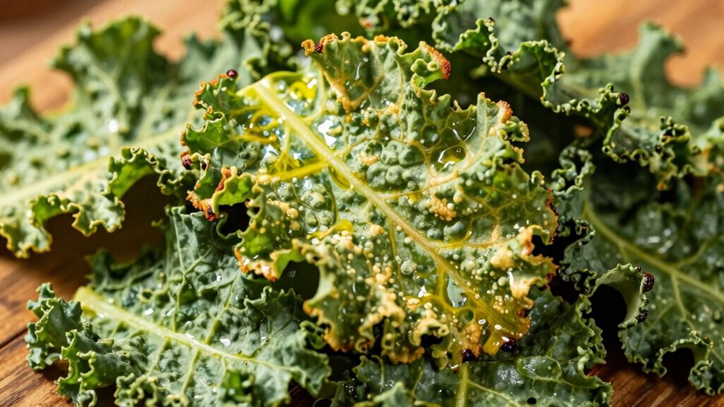 If your kale chips turn out burnt or bitter, the main culprits are often cooking at too high a temperature or for too long. Over seasoning mistakes can also cause bitterness, so be careful with salt and spices. Additionally, improper kale selection, like using old or damaged leaves, affects texture and flavor. To fix these issues: