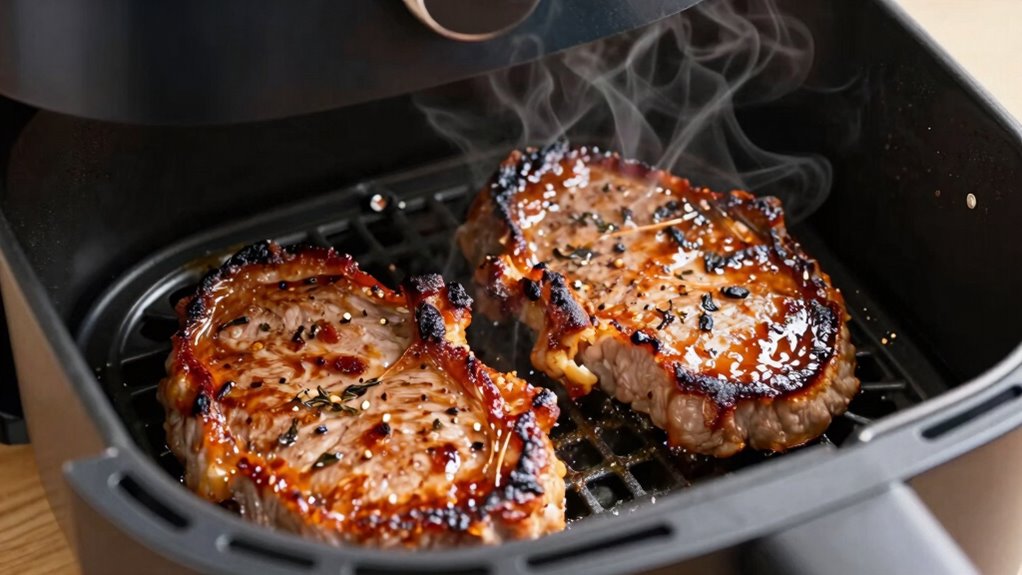 One of the biggest mistakes that can lead to dry and tough pork chops is overcooking them. To prevent this, pay attention to pork chop thickness; thinner cuts cook faster and are more prone to drying out, so adjust your cooking time accordingly. Always check your air fryer maintenance—residue or grease buildup can cause uneven cooking and hot spots, increasing the risk of overcooking. Use a meat thermometer to ensure you hit the ideal internal temperature without going over. Avoid cooking at excessively high temperatures, which can quickly dry out the meat. Proper air fryer maintenance and monitoring these factors will keep your pork chops tender and juicy instead of tough and dry. Proper awareness of chop thickness and cleaning your air fryer makes all the difference.