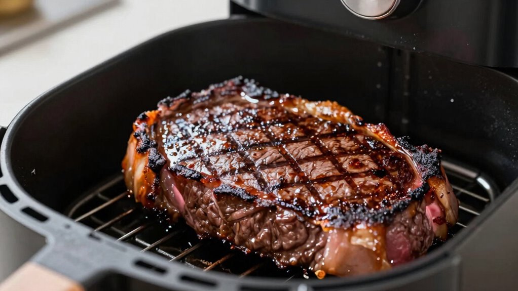 You don’t always need to preheat your air fryer for searing, but it can help attain better temperature consistency and quicker browning. Preheating guarantees the cooking environment is hot enough to develop a proper sear without overcooking the inside. If you’re aiming for that perfect crust, preheat for about 3-5 minutes. Otherwise, your steak might not develop the desired crust, risking uneven cooking and less flavor.