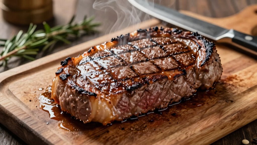 Resting meat can definitely improve overall flavor and texture. As you let it rest, the juices redistribute, enhancing flavor enhancement and ensuring each bite is juicy. This process also allows the muscle fibers to relax, leading to better texture improvement. By giving your meat a break, you prevent excess moisture from escaping, resulting in a more flavorful, tender, and satisfying meal that’s worth the wait.