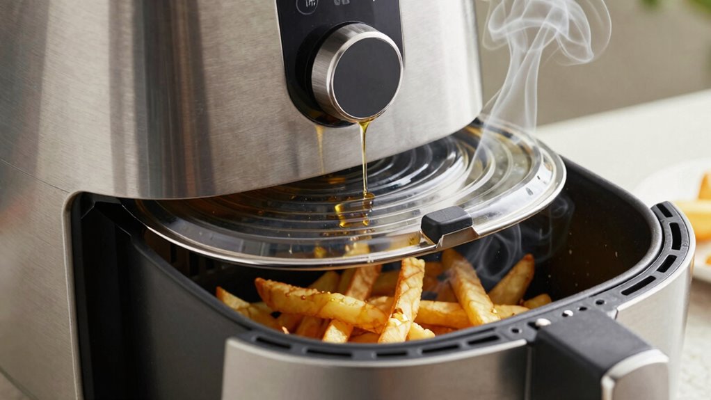 At higher altitudes, the lower atmospheric pressure causes oil smoke points to decrease, increasing your risk of oil degradation during cooking. For example, if you’re at 7,000 feet, an oil with a smoke point of 400°F might start smoking around 370°F. This means you need to adjust your temperature settings to prevent smoke and oil breakdown, ensuring healthier and more flavorful results when air frying.