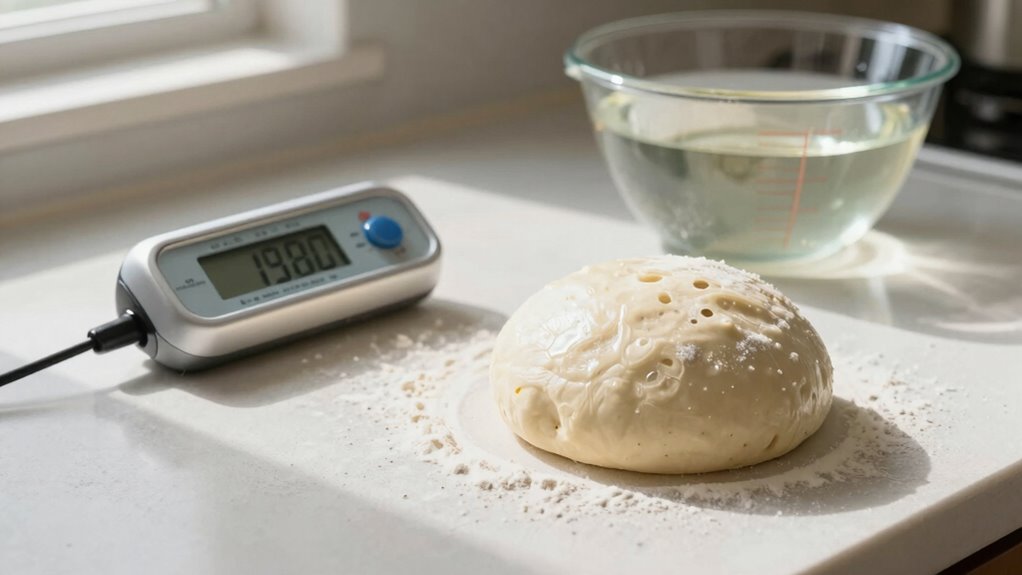 To measure dough temperature, you’ll need a reliable dough thermometer and a temperature chart. A digital thermometer works best for quick readings. Simply insert it into the dough’s center and wait for the reading. Having a temperature chart handy helps you understand the ideal temperatures for different types of dough. With these tools, you can guarantee your dough’s at the right temperature for perfect baking every time.