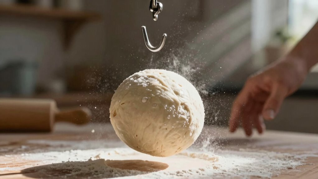 To keep your dough from climbing the hook, think of flour as the foundation of a sturdy building. Bread flour and high gluten flour have higher gluten content, giving your dough strength and structure. All-purpose flour works well too, but if you’re aiming for a softer texture, pastry flour can help. Whole wheat flour adds nutrition, but be cautious; its density might lead to climbing. Choose wisely for the best results!