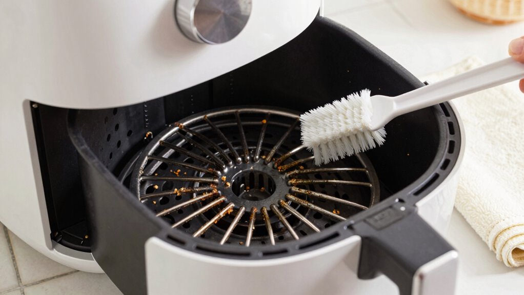 Don’t wait until things go south—clean your air fryer’s heating element regularly to keep it in tip-top shape. For good air fryer maintenance, aim to clean the heating element every 3 to 4 weeks, or sooner if you notice smoke or unusual odors. Regular cleaning prevents grease buildup and ensures even cooking. Stick to this cleaning frequency, and your appliance will serve you well for years to come.
