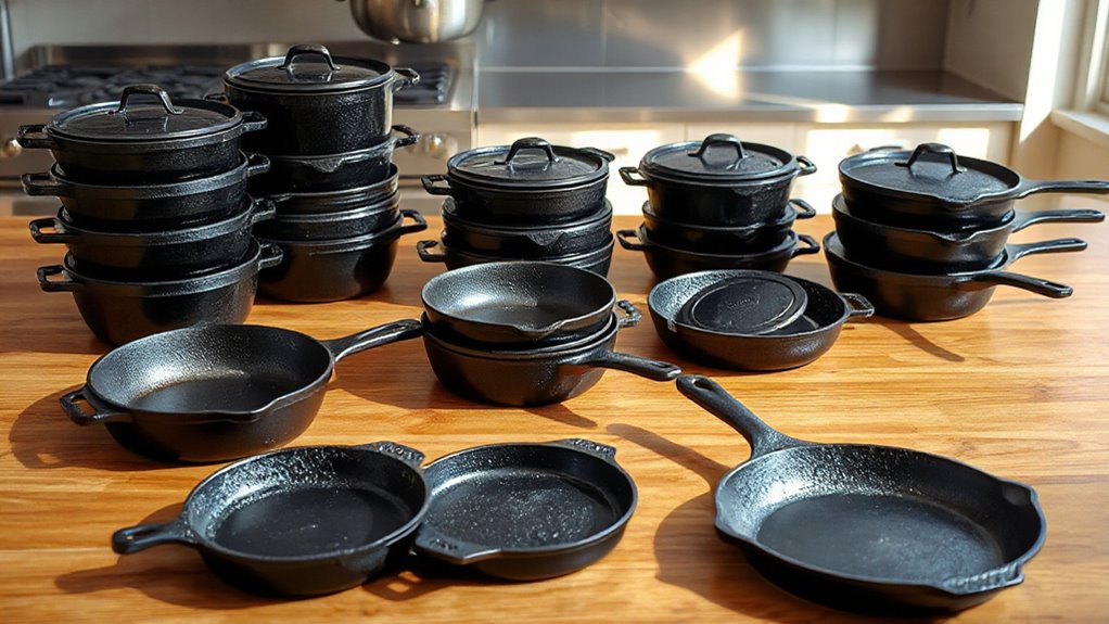 High-quality, thick cast iron makes a skillet set last for decades, especially when you care for it properly. Proper seasoning and regular maintenance, like re-oiling and rust removal, are key to extending its lifespan. Durable construction features, such as reinforced handles and thicker walls, help resist warping and damage over time. Sets that are pre-seasoned with natural oils and free from synthetic coatings tend to develop a resilient, long-lasting non-stick surface. To keep your skillet set in top shape, avoid dishwasher cleaning and ensure thorough drying after washing to prevent rust. With proper care, a well-made cast iron set becomes a reliable kitchen companion that can serve you for generations, making the investment well worth it.