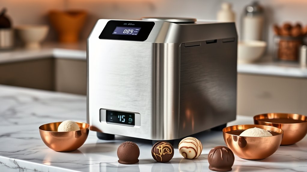 In wrapping up, choosing the right chocolate tempering machine is like selecting the perfect quill for a master scribe—crucial for crafting exquisite truffles. Whether you prefer a sleek countertop model or a robust commercial unit, I recommend considering your volume and precision needs. Remember, even in this modern age, a dependable machine remains the cornerstone of glossy, professional-quality chocolates. Embrace these options, and your truffles will surely impress, standing the test of time like a true Renaissance masterpiece.