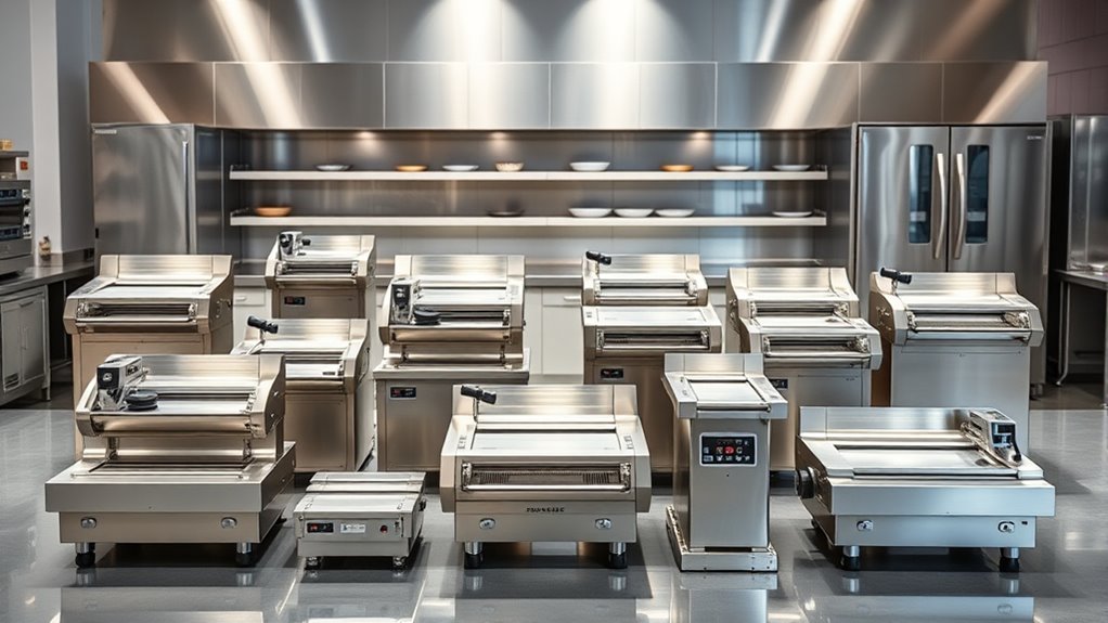 Modern electric dough sheeters are quite energy-efficient, often designed with energy-saving features like automatic shut-off and variable speed controls. I’ve found that they consume less power compared to older models, helping you save on electricity bills. Plus, many come with efficient motors that optimize performance without wasting energy. Overall, these machines balance power and efficiency, making them a smart choice for busy commercial kitchens aiming to reduce energy costs.