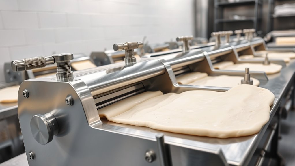 Imagine I’m in the 1800s, and you’re asking if these machines are suitable for home use today. Most commercial dough sheeters aren’t designed for home kitchens—they’re hefty, expensive, and require professional handling. However, some smaller, lightweight models exist that are perfect for serious home bakers. I’d recommend looking for compact, user-friendly options that fit your space and skill level, making laminated dough baking achievable at home.