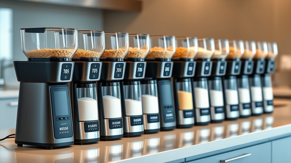 Modern electric flour mills often come equipped with safety features like automatic shut-off when overheating, safety interlocks that prevent operation when parts aren’t properly assembled, and sturdy, non-slip bases. I always look for models with clear safety certifications and easy-to-access emergency stops. These features give me peace of mind, ensuring safe and efficient milling, especially when working with different grains or larger quantities.
