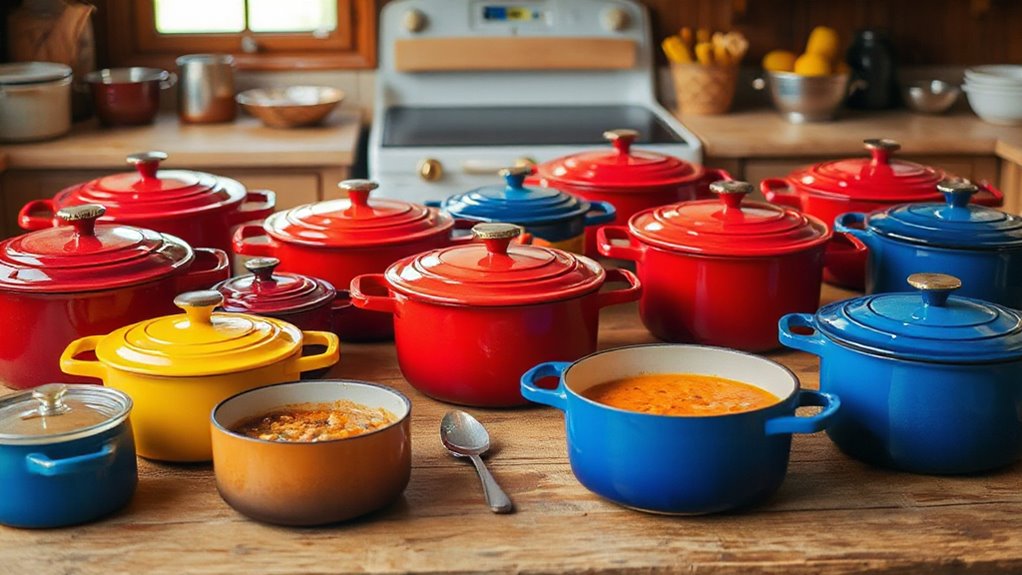 If you’re searching for the best enameled cast iron Dutch ovens for soups in 2026, I recommend models like the Umite Chef 5QT and 6QT, Lodge 6 Quart, AIVIKI 5QT, and Leonyo sauce pan. These options offer even heat distribution, durable enamel, vibrant colors, and excellent moisture retention. They’re perfect for slow-simmered soups and family meals. Keep exploring to discover more great choices that fit your cooking style and kitchen decor.