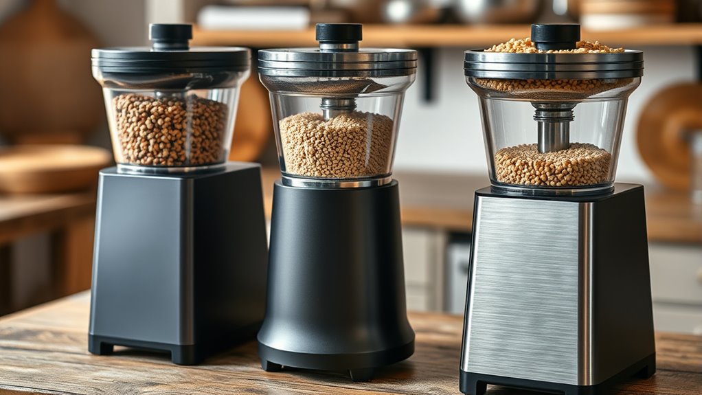 Choosing a grain mill with a straightforward cleaning process is essential for maintaining the purity of gluten-free flour and preventing cross-contamination. I look for models with removable canisters or grinding chambers, making it easy to clean thoroughly. Mills with smooth, sealed surfaces and minimal crevices help reduce flour buildup and simplify wiping down. Some units come with specialized cleaning tools, like brushes or built-in cleaning cycles, which make removing residual flour efficient and help prevent mold or bacteria growth. I also consider whether parts are dishwasher safe or require hand washing, as this impacts convenience and safety. Regular cleaning after each use is crucial for ensuring the mill’s performance and keeping gluten-free flour pure, free from contamination from other grains.