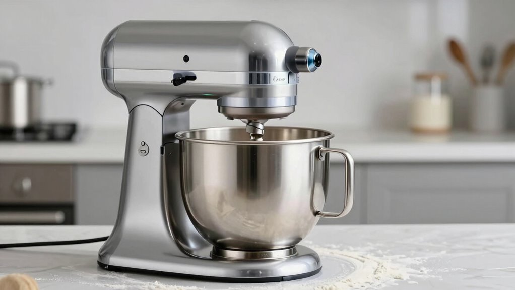 You’ll be amazed at how these premium mixers prioritize safety! They come with overload protection, automatic shut-off, and secure locking mechanisms that make them virtually foolproof. Some even have splash guards and anti-slip feet to prevent accidents. I’ve never seen such thoughtful features in a kitchen appliance, giving you peace of mind while tackling tough recipes. These safety measures aren’t just extras—they’re game-changers for confident, worry-free baking.