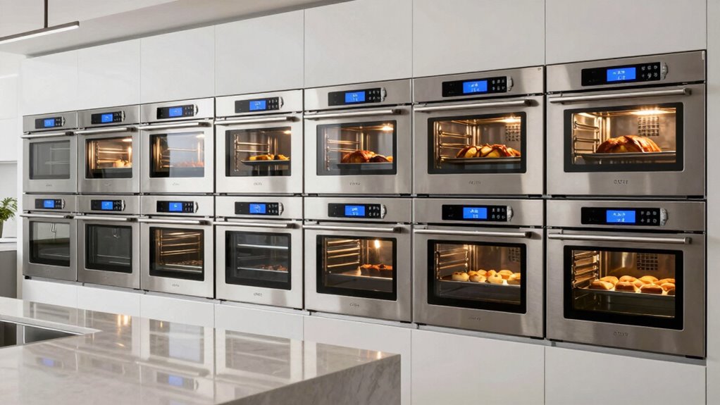 High-end convection ovens differ from standard models by offering superior features like precise temperature control, advanced heating elements, and better airflow for even cooking. I notice they often have smarter controls, more durable materials, and additional functions like steam or multi-rack cooking. These enhancements make them perfect for serious chefs or home cooks who want consistent, professional results. Overall, they’re more reliable, versatile, and built to last.