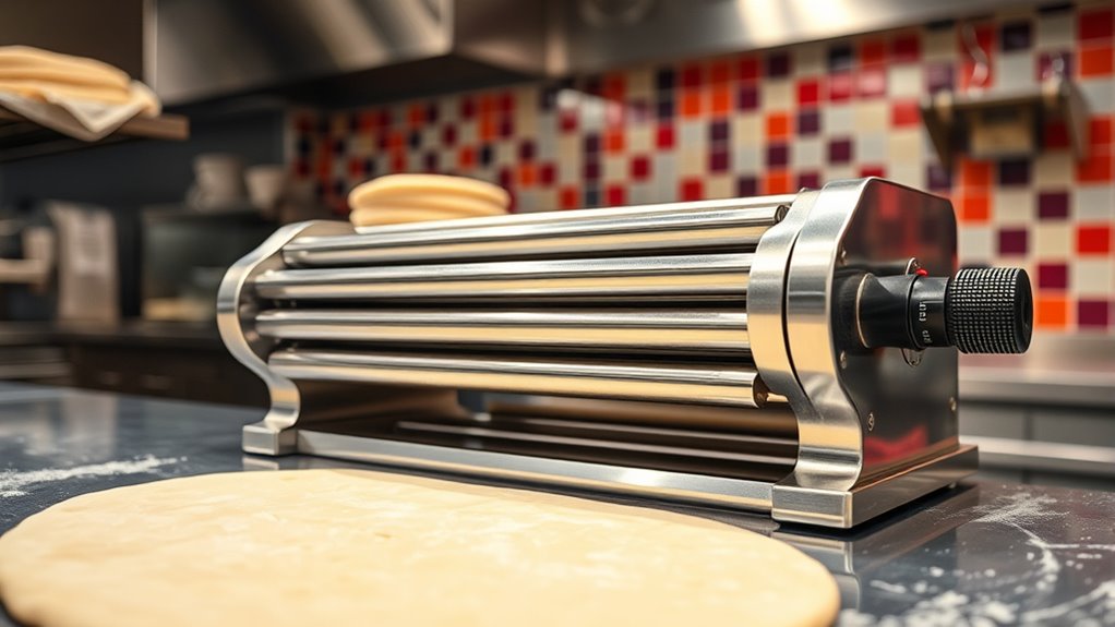 Think of a high-end sheeter as a finely tuned race car—designed for speed and precision. These machines outrun standard models, delivering consistent, thin dough layers rapidly, which boosts kitchen efficiency. Their motor power and advanced rollers mean less time waiting and more time creating perfect pizzas. I’ve seen them transform a busy kitchen into a well-oiled machine, making quick work of even the largest orders without sacrificing quality.