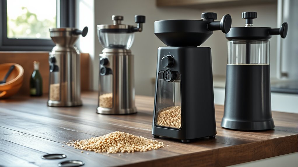 When selecting a high-end grain mill, ease of cleaning and maintenance can make a significant difference in daily use. I look for models with removable parts and accessible components that I can brush or wipe clean easily, without needing to disassemble everything. It’s best if the mill doesn’t require water washing or immersion, as moisture can damage internal mechanisms and pose safety risks. Some units come with dedicated cleaning brushes, which help me quickly remove residual flour and grains after each use. I also prefer mills with simple disassembly processes, allowing thorough cleaning of the grinding chambers and blades to prevent buildup and contamination. Overall, I prioritize devices that demand minimal effort for routine cleaning, reducing downtime and keeping performance consistent.