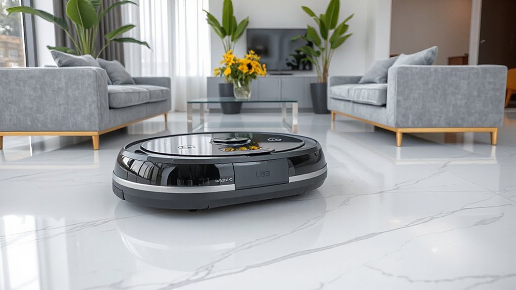 They’re quite effective across various floor types and handle surface shifts smoothly. I’ve noticed my high-end robot vacuum easily switches from hardwood to carpets without issues, thanks to advanced sensors and adaptive cleaning modes. It detects different surfaces and adjusts suction or mop settings accordingly. While no device is perfect, I find these vacuums do a great job maintaining cleanliness on diverse floors, making daily cleaning effortless for me.