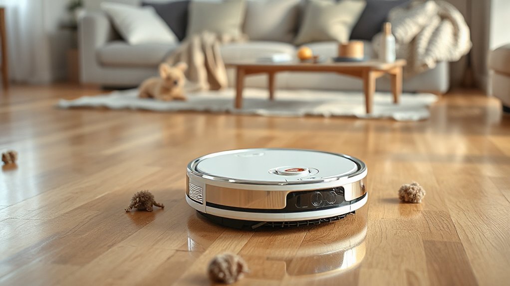 Handling pet hair effectively requires more than just strong suction; it involves smart features that prevent hair from tangling and guarantee thorough cleaning. High-end models deliver at least 5000Pa of suction power, ensuring embedded pet hair is lifted from carpets and hard floors. Many include anti-tangle or anti-hair wrap brushrolls that stop hair from wrapping around the brushes, reducing maintenance. Automated pet hair detection helps the robot identify high-traffic areas and switch to zone-specific cleaning, making the process more efficient. Some advanced robots feature self-cleaning brushrolls and self-emptying dust bins, minimizing manual effort. Enhanced filtration systems, like True HEPA filters, trap pet dander and allergens, improving air quality for sensitive pets and owners alike. These features collectively make pet hair cleanup faster and more effective.