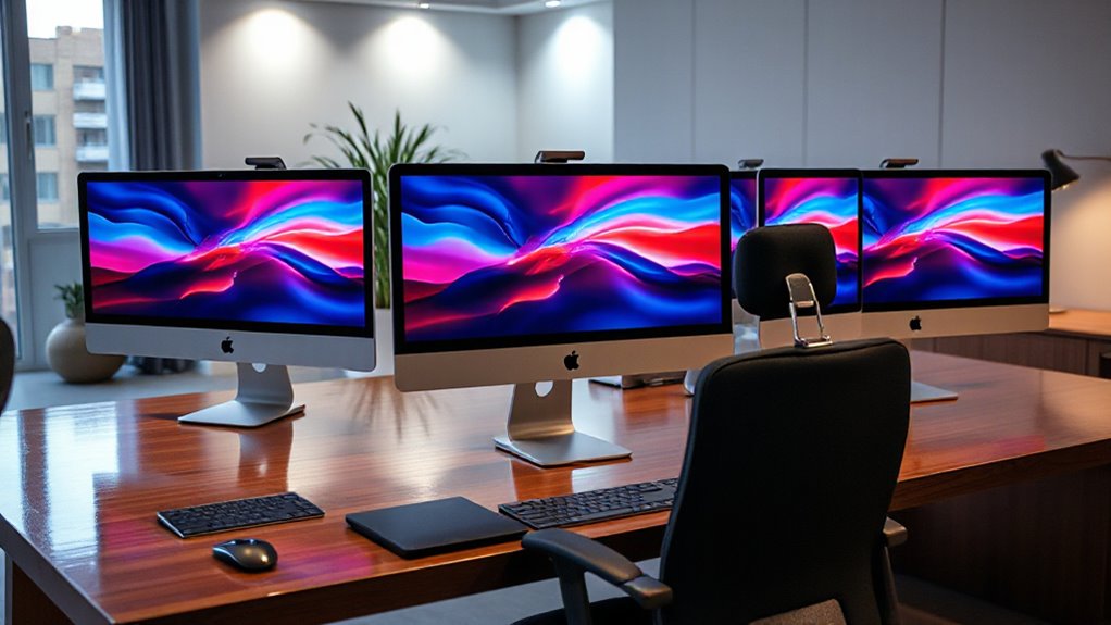 Ever wondered how display size and quality influence your productivity on a powerful iMac? A larger screen, like 24 inches, gives you more space for multitasking and detailed work, making it easier to manage multiple apps or complex projects. Retina or 4.5K displays deliver up to 1 billion colors, providing vivid, accurate visuals vital for creative tasks such as photo editing or design. Brightness levels around 500 nits improve visibility in different lighting conditions and sharpen image clarity. For power users, support for multiple external monitors, such as two 6K screens, considerably boosts workspace capacity. An immersive display with wide color gamuts and high pixel density ensures precise color accuracy and sharp visuals, enhancing both productivity and professional quality in everything you do.