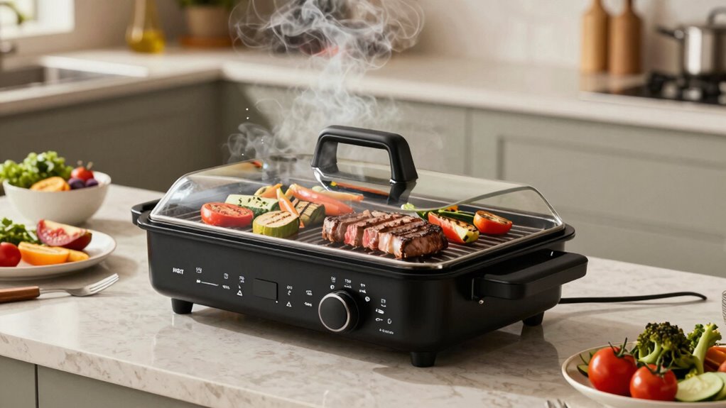 So, whether you’re craving juicy steaks or crispy veggies, the right smokeless indoor grill can transform your weeknights. Think of it as your secret weapon—turning busy evenings into delicious, smoke-free feasts. With options like adjustable temps or removable plates, you’re in control. Don’t let the chaos of dinner rush your flavor—embrace one of these top grills and make every meal a masterstroke. Your perfect weeknight dinner awaits—are you ready to grill?