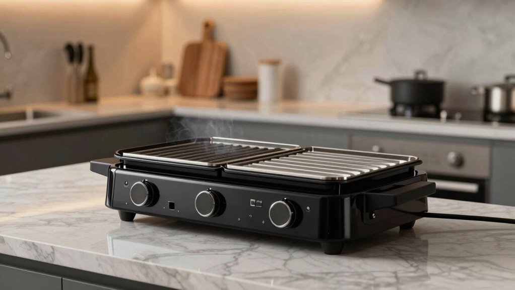 Think of these grills as the maestro conducting a symphony—they have adjustable temperature controls. I love how I can fine-tune the heat, whether I’m searing steaks or gently warming veggies. It’s like having a personal chef at my fingertips, ensuring perfect results every time. With precise temperature controls, I feel confident and in control, making indoor grilling both easy and enjoyable.
