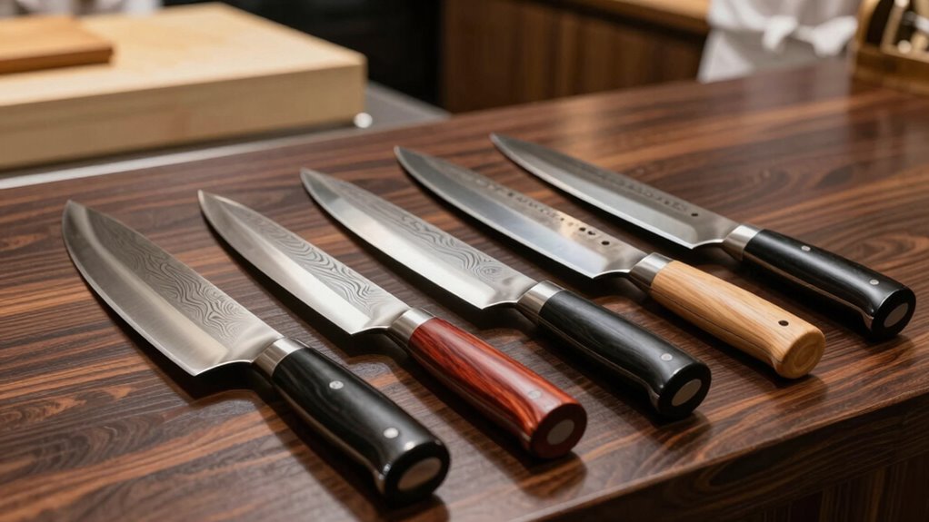 Japanese chef knife sets can be suitable for left-handed users, but it depends on the specific knives. Many traditional Japanese knives are crafted symmetrically, making them versatile for both hands. However, some knives are designed for right-handed use, with asymmetrical bevels. I recommend checking the product details or choosing knives labeled as ambidextrous or specifically for left-handed chefs to guarantee comfort and precision in your cutting tasks.