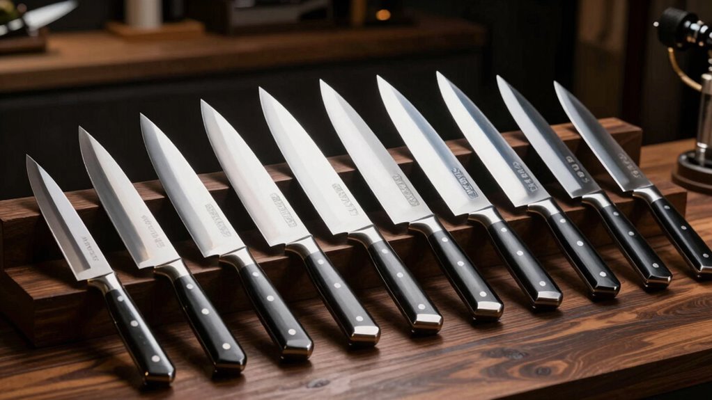 Blade edge angles play a crucial role in determining a Japanese chef knife’s cutting performance, especially when aiming for a razor-sharp edge. Most Japanese knives have angles between 10° and 15°, with lower angles delivering sharper, more precise cuts. A 10° edge offers exceptional sharpness, ideal for delicate slicing, but it may require more careful handling to prevent chipping or dulling. Conversely, a 15° angle provides a good balance, maintaining sharpness while offering increased resistance to wear and damage. The chosen angle directly affects the knife’s ability to handle different tasks—whether delicate or heavy-duty. Achieving the right edge angle involves precise grinding and polishing, which profoundly impacts the overall cutting performance and longevity of the knife.