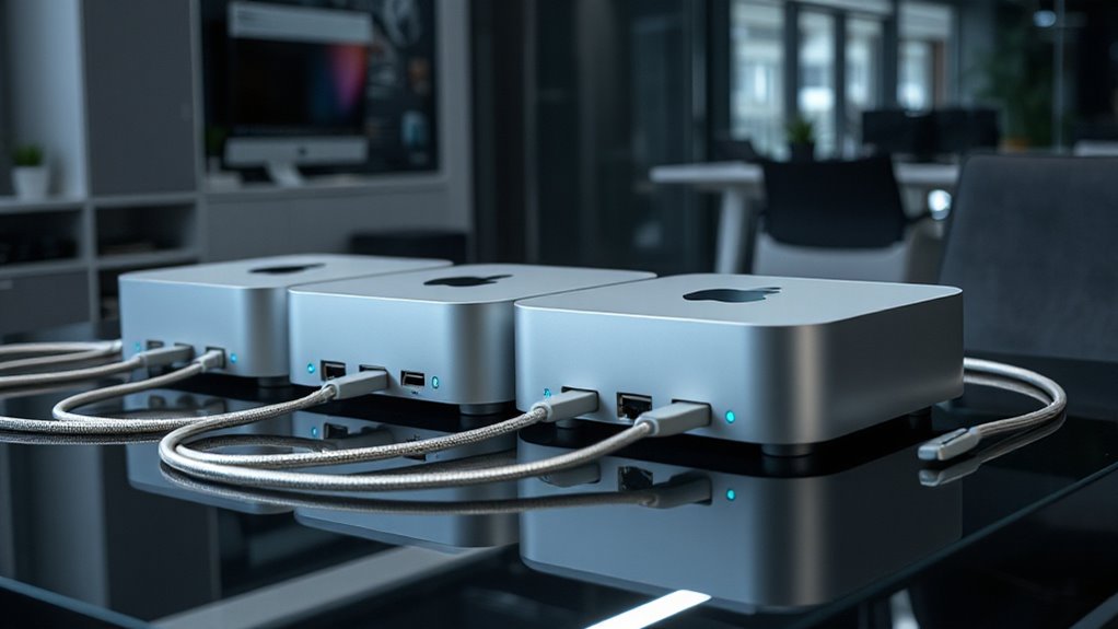 When selecting a Mac mini with 10Gb Ethernet, focusing on high-performance hardware like the M4 Pro chip is essential for future-proofing your investment. This guarantees your device can handle upcoming software updates and demanding applications without lag. I also recommend opting for the maximum RAM, such as 32GB, to support future multitasking and resource-intensive tasks. Choosing a model with expandable storage is wise, providing ample space for evolving data needs and software installations. Additionally, confirm the Mac mini supports the latest connectivity standards like Thunderbolt 4 and Wi-Fi 6E, which will facilitate seamless integration with future peripherals and network upgrades. Ultimately, selecting a Gigabit Ethernet port configurable to 10Gb Ethernet helps future-proof your network capabilities as infrastructure evolves and speeds increase.