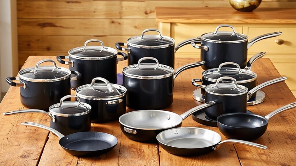 Choosing a premium nonstick cookware set means paying close attention to the materials used, as durability and safety go hand in hand. I look for sets made from anodized aluminum, stainless steel, or reinforced die-cast aluminum because they resist warping and handle frequent use without compromising performance. Safety is equally important; I prefer coatings free from harmful chemicals like PFOA, PTFE, and PFAS, which can emit toxic fumes if overheated. The best sets feature reinforced, thick coatings that resist scratches and last longer. Handles made from BPA-free silicone or Bakelite are a must—these materials stay cool and reduce burns. Certifications like PFOA-free or FDA safety standards give me confidence that the cookware is both durable and safe for everyday use.