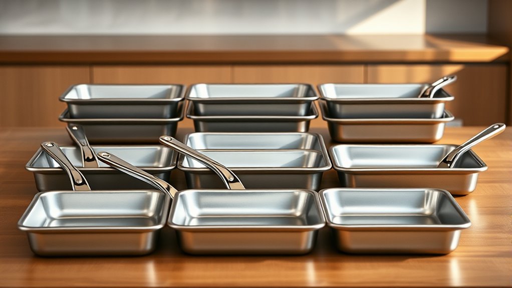 Choosing a professional sheet pan set begins with ensuring the materials are both durable and safe. High-quality pans are usually made from stainless steel, aluminized steel, or heavy-gauge aluminum, which resist warping and last through frequent use. Safe pans should be free from toxic chemical coatings like PFOA, PTFE, or PFOS, preventing harmful chemicals from leaching into your food. Materials such as uncoated aluminum and stainless steel are non-reactive, making them perfect for acidic ingredients without darkening or pitting. Certified food-safe materials and adherence to health safety standards are essential to guarantee the pans are non-toxic and suitable for repeated use. Additionally, reinforced rims and sturdy construction improve safety by reducing the risk of warping during high-temperature baking.