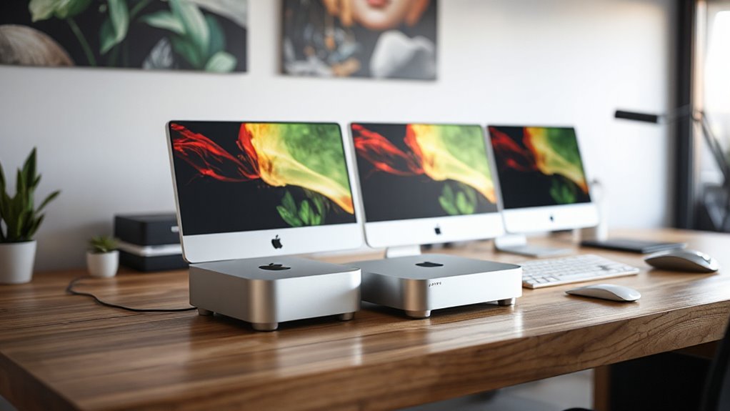 Choosing the right memory and storage options can substantially impact your renewed Mac mini’s overall performance. I recommend opting for at least 16GB of RAM, with 24GB or more if you plan to multitask heavily or handle demanding applications like video editing. The storage capacity is equally important; models range from 256GB to 2TB SSDs. More storage means faster data access and less reliance on external drives, which is vital for large files and professional workflows. Upgrading both memory and storage can markedly boost performance, especially for intensive tasks. Keep in mind that ample unified memory helps multiple applications run smoothly without slowdowns. Selecting a model with sufficient SSD storage ensures quick access to your data and a more responsive experience overall.