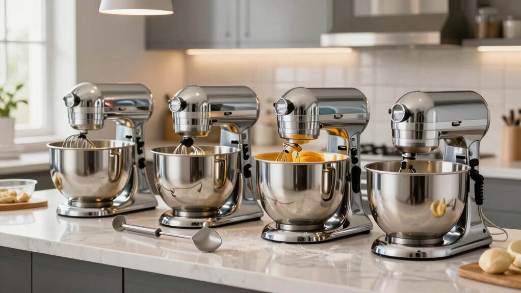 - Mixers include powerful motors (600W–1100W) and large bowls up to 20 quarts for handling substantial ingredients.