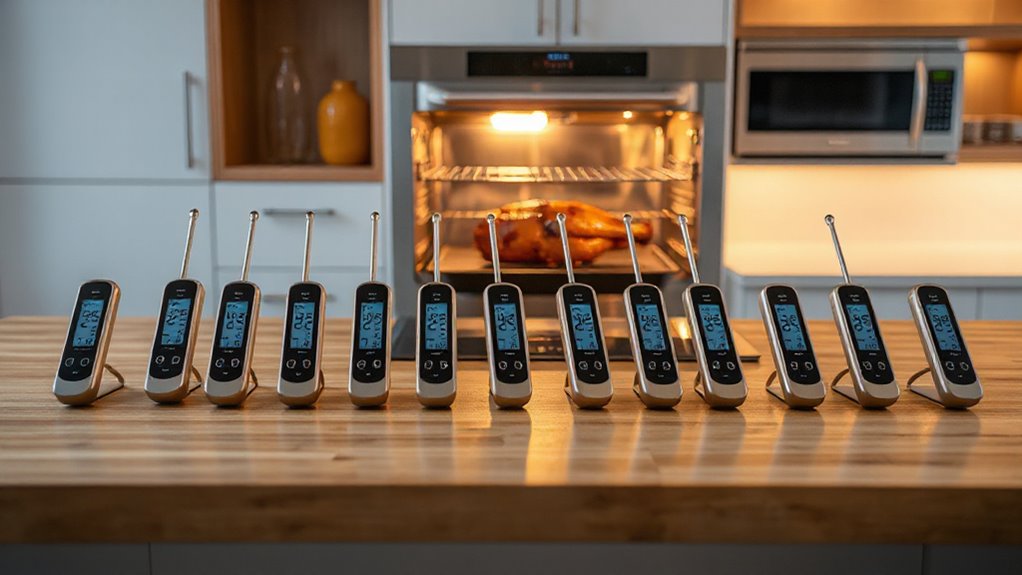 Choosing the right number of probes is essential for achieving accurate and versatile cooking results in your oven. With multiple probes, I can monitor several dishes or different parts of a large cut of meat simultaneously, ensuring even doneness. Sensors with NIST certification give me confidence in their reliability and precision, which is critical for perfect results. Dual or multiple sensors help me measure both internal meat temperature and ambient oven conditions, allowing better control. Ultra-thin probes minimize puncture and juice loss, especially important for delicate meats or high-quality cuts. Additionally, the durability and heat resistance of the sensors matter, as they need to perform well under high temperatures during grilling or roasting. Overall, the right sensor count and quality enhance accuracy and flexibility in my cooking.